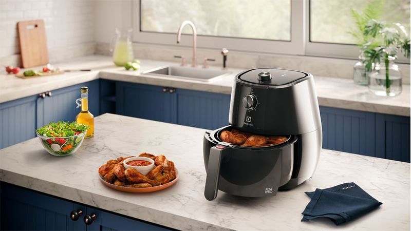 Testes realizados por nutricionista, com iscas de peixe empanado (250 g de tilápia) e duas formas de preparação - fritura convencional (utilizando 828g de óleo de girassol) e na Airfryer (utilizando 2g de azeite). O resultado demonstrou a redução de 48,6% de calorias e 89,4% de gordura quando preparado na Airfry.