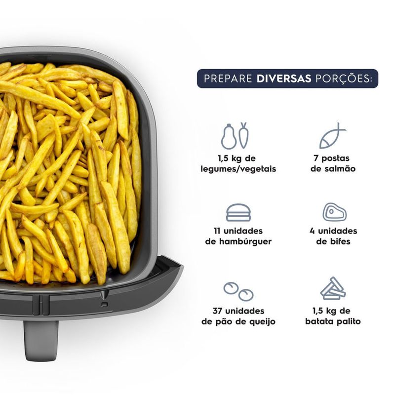 Sua tecnologia de circulação de ar Air Cooking 360° garante uma maior precisão na elaboração dos alimentos, deixando-os crocantes por fora e macios por dentro.