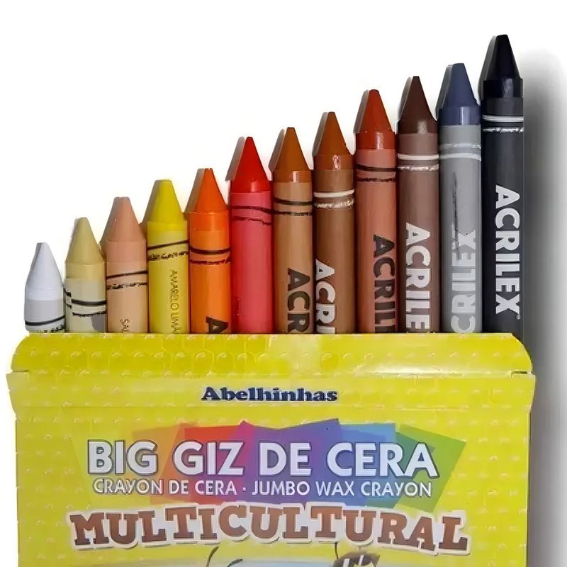 Descubra o Big Giz de Cera 12 Cores Multicultural - Acrilex, a ferramenta ideal para estimular a criatividade de crianças na pré-escola e em atividades escolares. Fabricado com ceras selecionadas, este giz proporciona traços macios e uma cobertura superior, ideal para colorir com intensidade e uniformidade. Seu formato Big e anatômico é desenhado para o conforto das mãos pequenas, facilitando o manuseio e o desenvolvimento da coordenação motora. Além disso, as 12 cores vibrantes e o conceito multicultural enriquecem as atividades, enquanto os rótulos individuais com o nome da cor auxiliam na organização e no aprendizado.