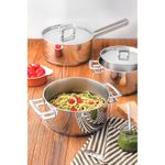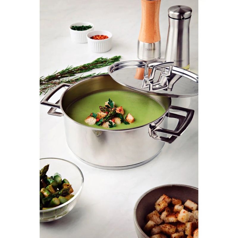 O fundo triplo, composto por aço inox, alumínio e aço inox, garante uma distribuição de calor uniforme por toda a panela. Isso resulta em um cozimento mais rápido e eficiente, além de proporcionar economia de energia ao permitir o uso de fogo baixo.