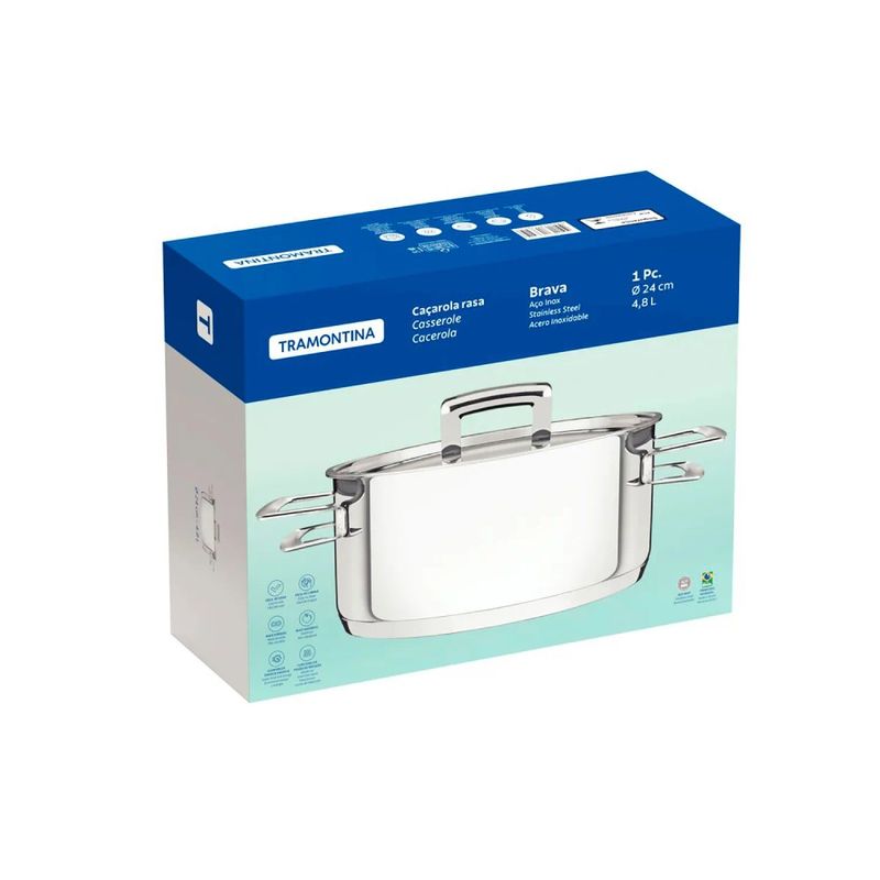 A Caçarola de Inox Brava 24cm - Tramontina é o utensílio essencial para quem busca excelência e praticidade na cozinha. Desenvolvida com fundo triplo (aço inox, alumínio, aço inox), esta caçarola garante uma distribuição de calor uniforme e eficiente, resultando em um cozimento mais rápido e economia de energia. Sua fabricação em aço inoxidável de alta resistência assegura durabilidade prolongada e a não liberação de resíduos, tornando suas refeições mais saudáveis. Com 4,8 litros de capacidade e 24 cm de diâmetro, é ideal para diversas receitas, podendo ser utilizada em fogões a gás, elétricos, vitrocerâmicos e por indução, além de ir ao forno até 260°C. O design elegante, com tampa plana e saída de vapor, complementa qualquer cozinha moderna.