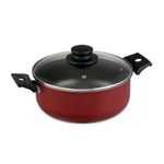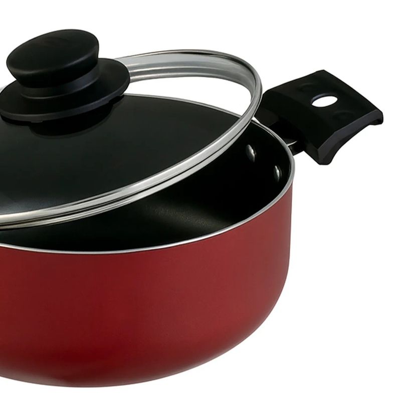 A caçarola possui estrutura em alumínio com revestimento antiaderente, tampa de vidro temperado e cabo de baquelite.