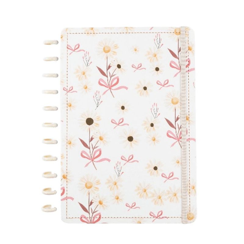 Descubra a inovação em organização e estilo com o Caderno Laços Flor G - Diskô, o caderno reposicionável ideal para sua rotina de estudos ou trabalho. Com seu sistema exclusivo de encadernação por discos, você obtém total liberdade para adicionar, remover e reorganizar as 80 folhas de papel Pólen 90g (60 pautadas, 20 lisas), personalizando a experiência. Este item essencial de papelaria e material escolar destaca-se pela sua resistência, com capa e contracapa rígidas, laminadas com acabamento soft touch e impressas em papel Couchê 150g, além de um forro interno em Papel Supremo 350g. Seu design com estampa de laços e flores, em cores amarelo e branco, aliado ao prático elástico de fechamento, assegura que seu caderno esteja sempre protegido e elegante, acompanhando você em cada momento.