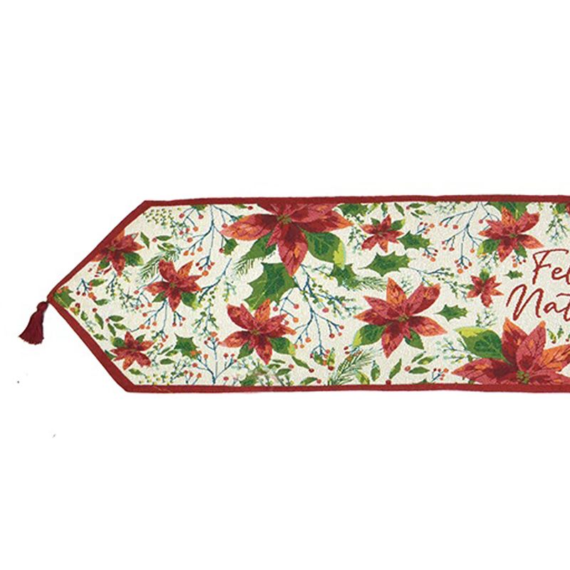 O Caminho de Mesa Natalino 35x180cm Feliz Natal Flores - Espressione Christmas tem estampa encantadora para adicionar muito charme à decoração da mesa e do ambiente na época mais bonita do ano. Confeccionado em tecido misto de algodão e poliéster, possui excelente acabamento com tassels nas pontas que causam um efeito lindo.