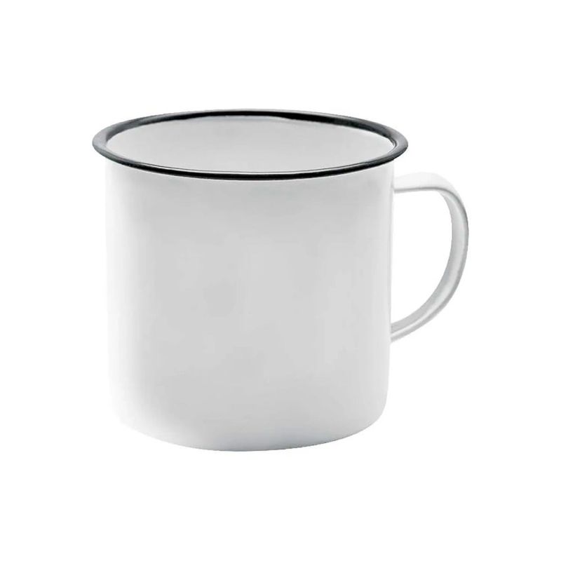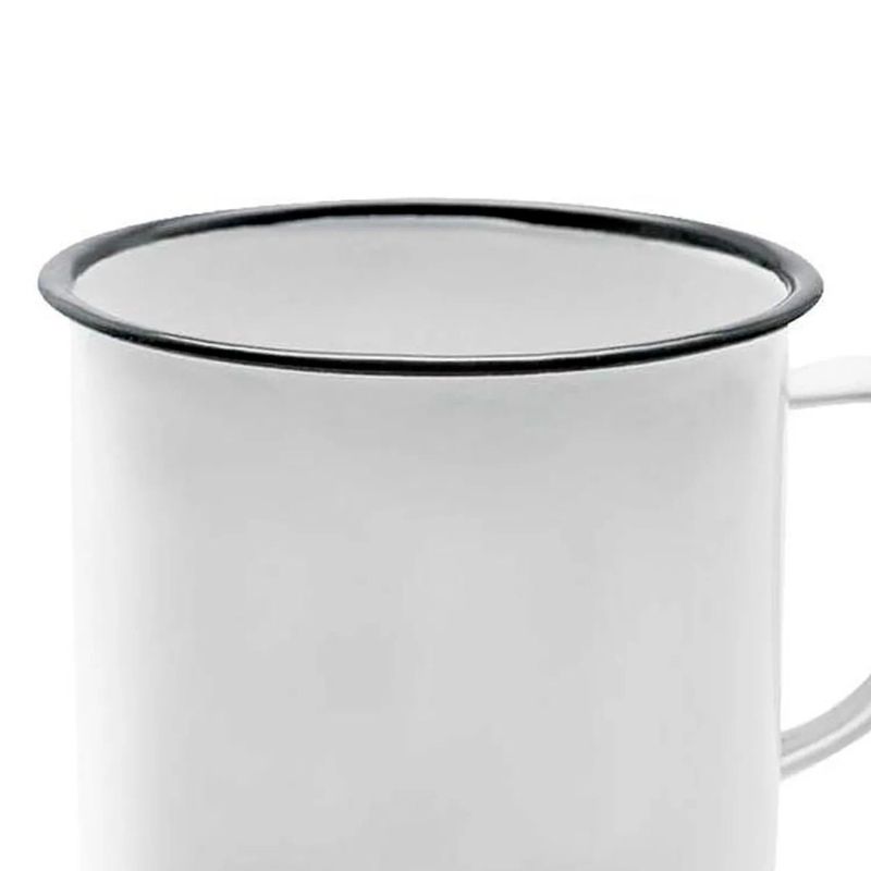 A caneca é fabricada em metal com acabamento esmaltado, conferindo durabilidade e um visual clássico.
