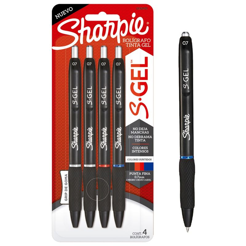 O conjunto da Caneta em Gel 0.7mm 4 Peças - Sharpie inclui uma seleção de cores: você encontrará duas canetas com tinta preta, uma caneta com tinta azul e uma caneta com tinta vermelha, adequadas para diversas necessidades de escrita e organização.