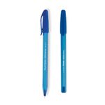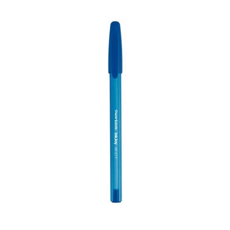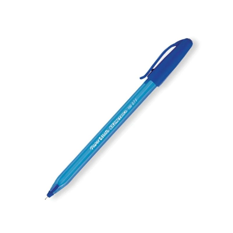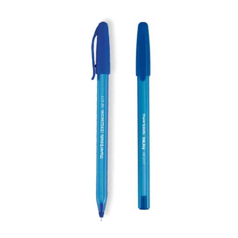 Caneta Esferográfica Ponta Fina 0.7mm Azul - Paper Mate. As canetas esferográficas da Paper Mate possuem a exclusiva tinta Inkjoy, que proporciona uma escrita macia, sem falhas com secagem rápida e cores muito mais vibrantes. O corpo triangular nas canetas sem grip oferece conforto e ergonomia e a cor da tampa indica a cor da tinta. Corpo triangular Com tampa Pontas de 0.7mm Secagem rápida