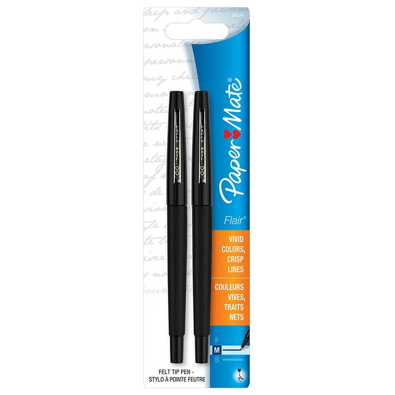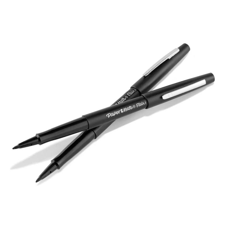A Caneta Flair Média Preta 2 Peças - Paper Mate eleva a experiência da escrita e coloração, transformando cada traço em uma expressão vibrante. Projetada para quem busca precisão e criatividade, este conjunto de canetas de feltro oferece pontas médias de 0.7mm que garantem linhas marcantes e precisas. Sua tinta à base de água, na intensa cor preta, é formulada para ser resistente a manchas e para não vazar através do papel, mantendo os trabalhos impecáveis. O exclusivo sistema Smart Guard da Paper Mate protege as pontas contra o desfiamento, assegurando um fluxo de tinta consistente, ideal para uso diário em estudos, trabalho ou projetos criativos.