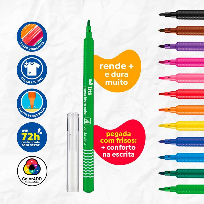 A ponta fina bloqueada da Canetinha Hidrocor Tris oferece precisão nos traços, sendo ideal para detalhes, contornos e escrita. Além disso, essa característica confere maior resistência à ponta, evitando que ela afunde mesmo com o uso mais intenso, o que assegura uma experiência de uso consistente e prolongada.