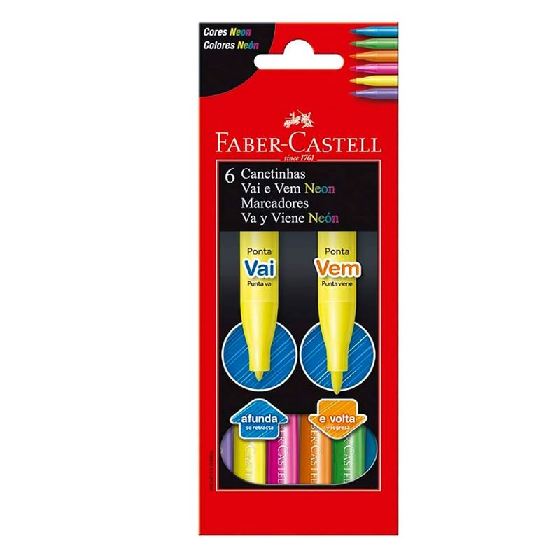 A Canetinha Vai e Vem Neon 6 Cores - Faber-Castell é a escolha ideal para estimular a criatividade e a diversão das crianças. Desenvolvida com a exclusiva tecnologia Vai e Vem, esta canetinha possui um sistema de amortecimento contra impactos na ponta, garantindo maior resistência, mesmo com uso frequente. Com uma paleta de 6 cores neon vibrantes e tinta à base de água lavável e não tóxica, oferece segurança e praticidade para os pequenos artistas. Ideal para desenhos e atividades escolares, a Canetinha Vai e Vem Neon combina funcionalidade, design inteligente e a reconhecida qualidade Faber-Castell.