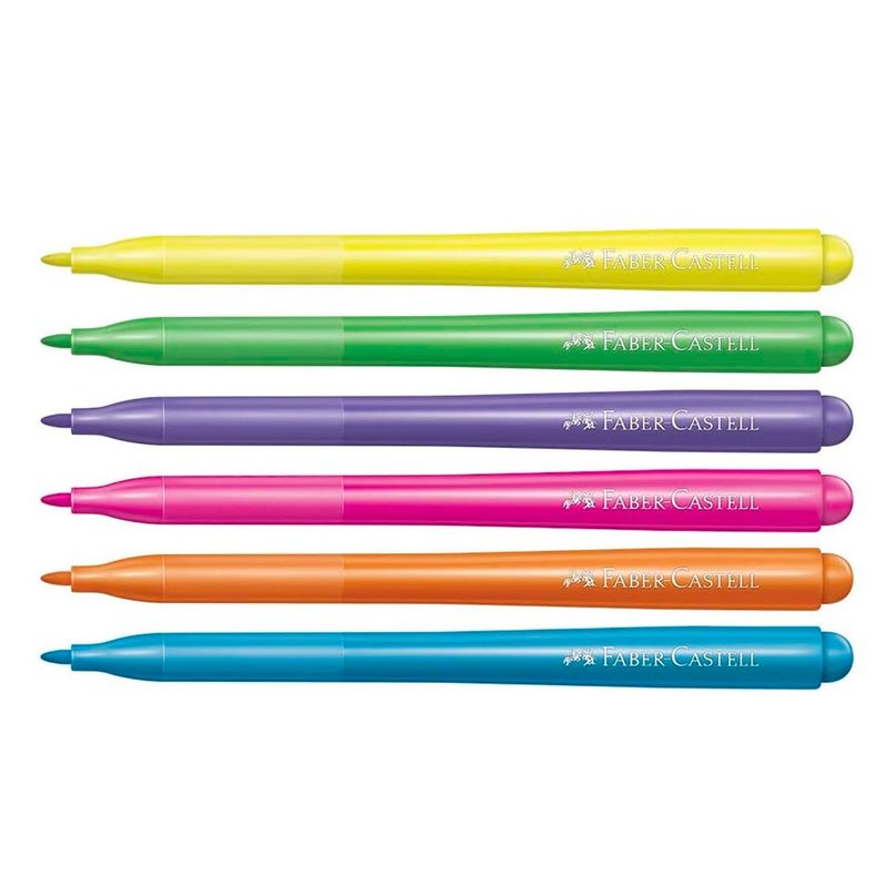 As 6 cores neon vibrantes da canetinha Faber-Castell estimulam a criatividade e a expressão artística das crianças. Elas adicionam um toque divertido aos trabalhos, tornando os desenhos e projetos escolares mais visíveis e dinâmicos, capturando a atenção com sua intensidade luminosa.