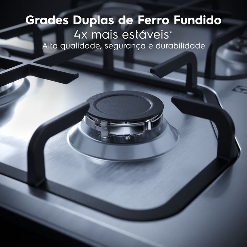 As grades de 4 apoios de ferro fundido proporcionam aderência perfeita ao fundo das panelas. São 4x mais estáveis³, garantindo alta qualidade, segurança e durabilidade no uso diário.