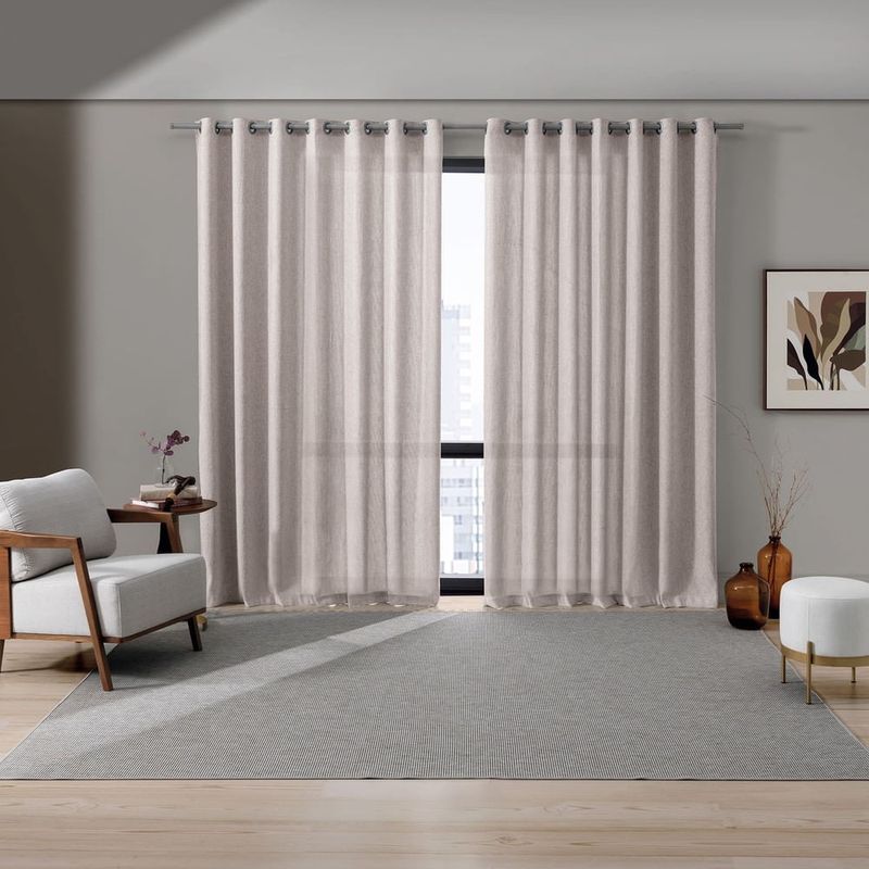 O tecido 100% Poliéster da Cortina Rústica Suez proporciona elevada resistência, além de ser fácil de cuidar. Ele oferece um ótimo equilíbrio entre a entrada de luz natural e a privacidade, criando um ambiente convidativo e elegante sem ser excessivamente pesado.