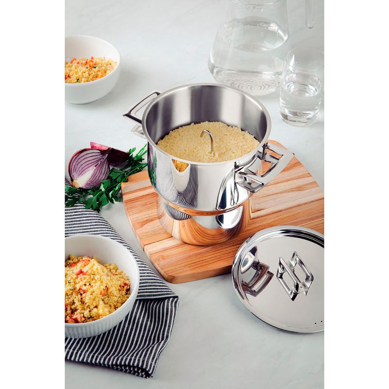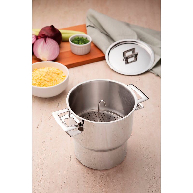 A Cuscuzeira Brava 14cm Inox - Tramontina é a escolha perfeita para preparar suas receitas favoritas com praticidade, elegância e qualidade. Com capacidade de 2,1 litros, ela é ótima para cozinhar ao vapor, garantindo alimentos mais saborosos e nutritivos. Seu design moderno e acabamento em alto brilho valorizam qualquer cozinha, unindo beleza e funcionalidade no dia a dia. Feita pela fabricante Tramontina, a cuscuzeira é confeccionada em aço inox de alta durabilidade, não libera resíduos, preserva o sabor e a saúde dos alimentos. A cuscuzeira conta com tela perfurada para o cozimento a vapor e tampa com saída de vapor e encaixe perfeito, assegurando um preparo homogêneo e seguro. Leve e resistente, pode ser lavada diariamente na lava-louças e utilizada em fogões a gás, elétricos e vitrocerâmicos não indicada para indução. Com altura de 17,8 cm, diâmetro de 14 cm e peso de 500 g, é prática, compacta e eficiente. Ideal para quem busca qualidade e durabilidade em cada preparo.