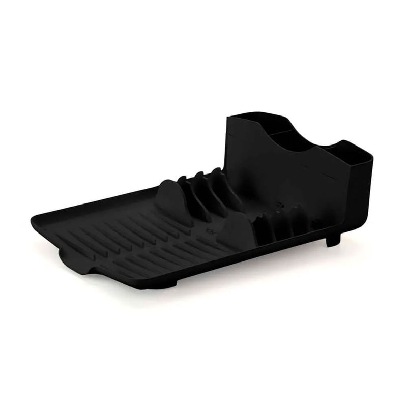 Não, o Escorredor Louça Seca Preto Compacto - Dasplast foi projetado para uma secagem eficiente e direta. Ele não possui uma bandeja coletora de água, o que o torna ideal para ser posicionado diretamente sobre a pia ou em superfícies que permitam o escoamento natural da água, evitando acúmulo e facilitando a limpeza. A ausência de bandeja contribui para seu design compacto e prático.