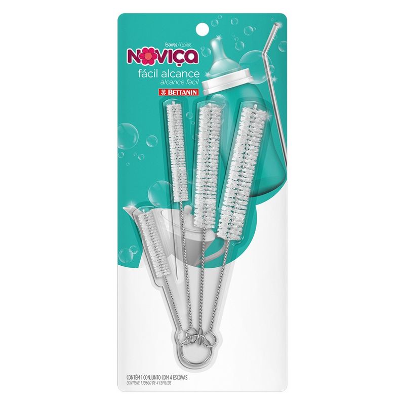 A Escova Fácil Alcance Noviça é a solução ideal para a higienização de recipientes profundos e áreas de difícil acesso. Desenvolvida para otimizar a limpeza, este conjunto oferece quatro modelos de escovas, cada uma com tamanho específico para atender a diversas necessidades. Seu design inteligente permite alcançar locais como canudos, mamadeiras, bicos de chaleira e até grades de ventiladores e ar condicionados, garantindo uma limpeza completa e eficaz. Fabricadas com cabo em aço inoxidável e cerdas em material sintético, as escovas combinam durabilidade e flexibilidade para uma performance superior.