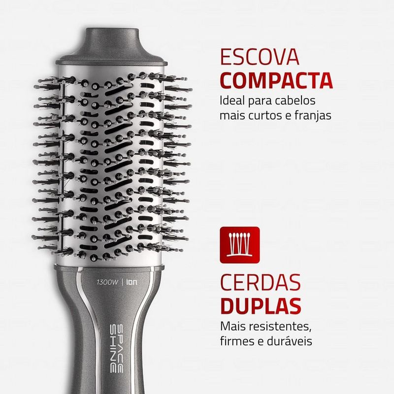A Escova Secadora Space Shine Prata ES-20 - Mondial é a ferramenta ideal para quem busca praticidade e resultados profissionais. Com design slim e compacto, foi desenvolvida para modelar cabelos curtos e franjas com precisão, garantindo um acabamento impecável. A tecnologia de revestimento cerâmico com Tourmaline Íon protege os fios do calor, reduz o frizz e confere um brilho radiante. Operando em Bivolt e com 1300W de potência, esta escova secadora oferece 3 ajustes de temperatura e cerdas duplas, sendo ideal para levar em viagens e manter seus cabelos sempre deslumbrantes.