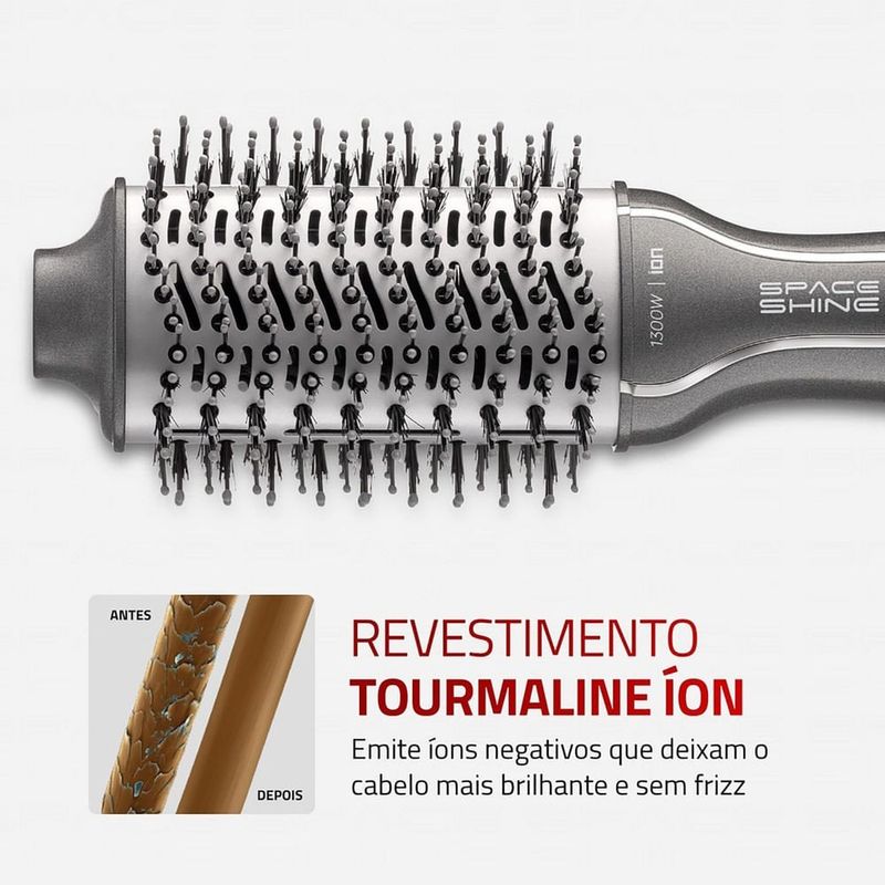 A tecnologia Tourmaline Íon, combinada com o revestimento cerâmico, libera íons negativos que neutralizam a eletricidade estática dos fios. Isso reduz o frizz, sela as cutículas capilares e intensifica o brilho natural do cabelo, deixando-o mais macio, sedoso e com aspecto saudável.
