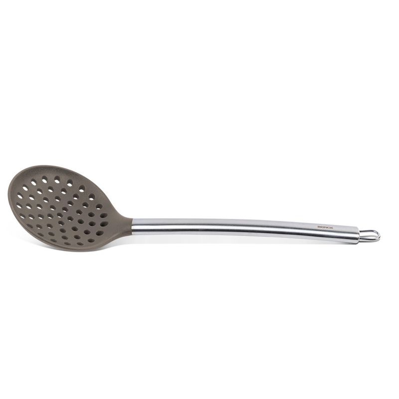 A Escumadeira Duo 34,5cm Cinza - Brinox é essencial na cozinha, especialmente para quem não dispensa frituras. Seu formato é próprio para pegar os alimentos com maior segurança, sem que se desfaçam e para deixar escorrer o excesso de óleo, possibilitando quitutes menos gordurosos e consequentemente mais saudáveis. Feita de silicone, material resistente e higiênico, que não agride a superfície das panelas, além de ser fácil de lavar.
