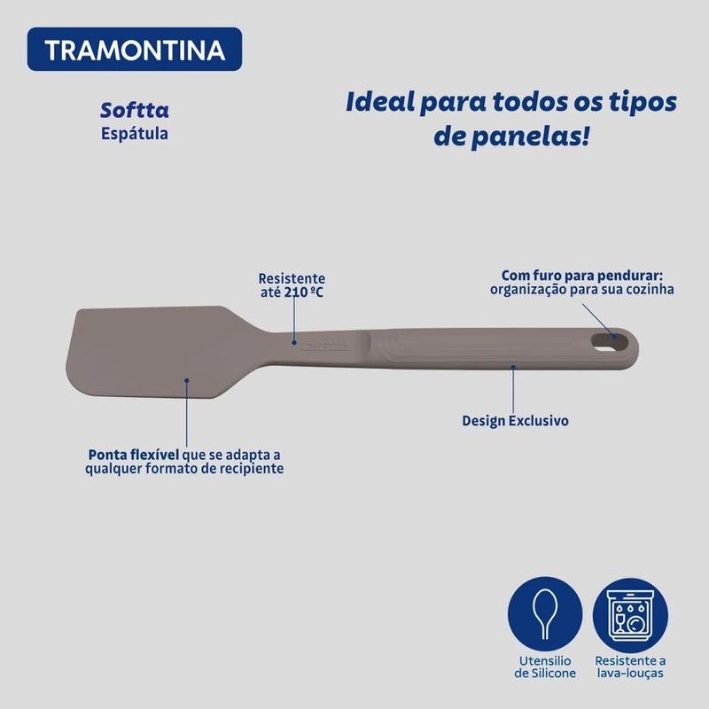 A Espátula de Silicone Softta Cinza - Tramontina é o utensílio essencial para aprimorar sua experiência na cozinha, unindo praticidade e um design pensado para o uso diário. Fabricada em silicone, ela suporta temperaturas de até 210°C e é ideal para uso em panelas antiaderentes e cerâmicas, protegendo-as contra riscos. Seu design ergonômico proporciona manuseio confortável e eficaz, enquanto a ponta flexível garante o aproveitamento total de cada ingrediente, raspando cremes e massas sem desperdício. A facilidade de limpeza, sendo compatível com lava-louças, e o furo passante no cabo para pendurar, otimizam o espaço e a organização da sua cozinha. Este item seguro, em conformidade com as resoluções da ANVISA e FDA, é a escolha para quem busca eficiência e cuidado no preparo de suas receitas.