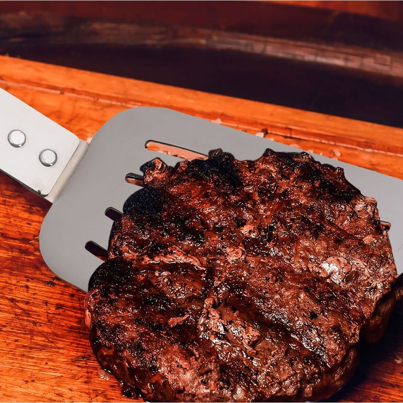 A espátula possui dimensões ideais para um manuseio seguro e eficiente: 52 cm de comprimento, 10 cm de largura e 5 cm de altura. O comprimento total de 52 cm é perfeito para alcançar grelhas e chapas quentes, mantendo suas mãos a uma distância confortável do calor.