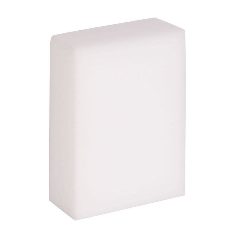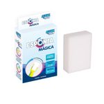A esponja é fabricada com espuma de melamina, um material reconhecido pela capacidade de remover manchas e sujeiras incrustadas. Suas dimensões são 10 cm de comprimento, 7 cm de largura e 3 cm de espessura.