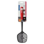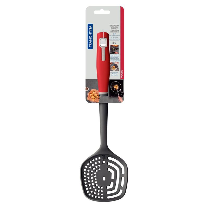 Espumadeira Nylon Verano Vermelho - Tramontina. Pense num item ideal para te ajudar nos preparos da cozinha certamente ele possui cabo resistente e ergonômico em polipropileno, bojo produzido em nylon, furos e rasgos para escoar líquidos, furo para retirada de temperos, design moderno e uma cor vibrante. Perfeito, não é Pois você tem tudo isso com a espumadeira com furo Tramontina Verano com bojo em nylon e cabo de polipropileno vermelho. Saborosas receitas e momentos especiais estão garantidos com esse item em sua casa Espumadeira de nylon, que resiste até uma temperatura de 180 C. Cabo de polipropileno com furo passante possibilitando que seja pendurado na sua cozinha. Utensílio ideal para uso em panelas com revestimentos antiaderentes e cerâmicos, pois não danifica o produto. Pode ir à máquina de lavar louças facilitando seu dia a dia.
