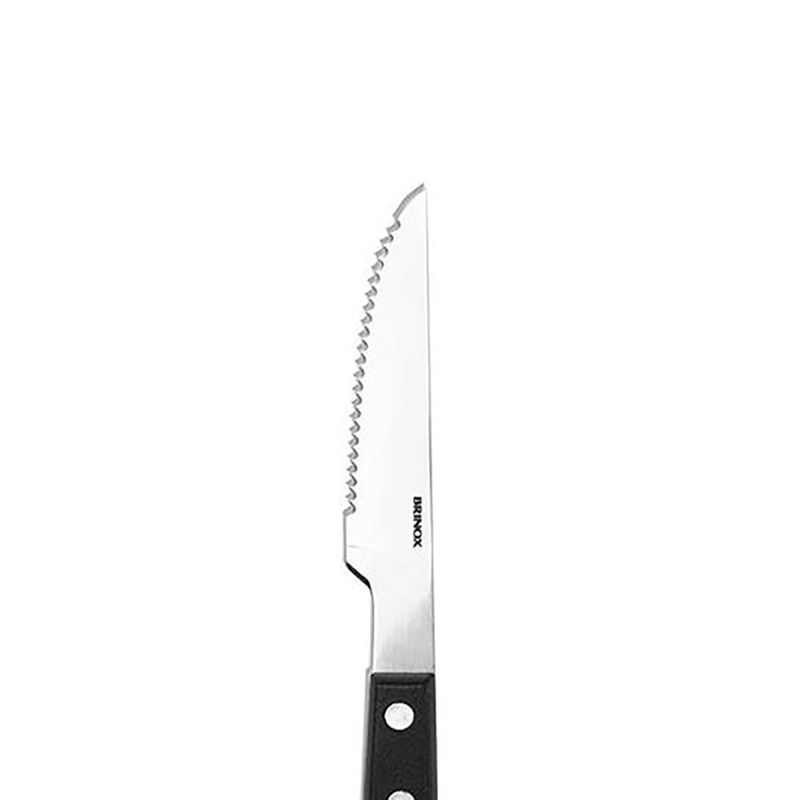 A Faca Churrasco Brinox possui uma lâmina serrilhada. Este tipo de lâmina é ideal para churrasco, pois permite cortar diferentes tipos de carne com maior facilidade e precisão, deslizando pela fibra sem rasgar, o que preserva a suculência e a apresentação do alimento.