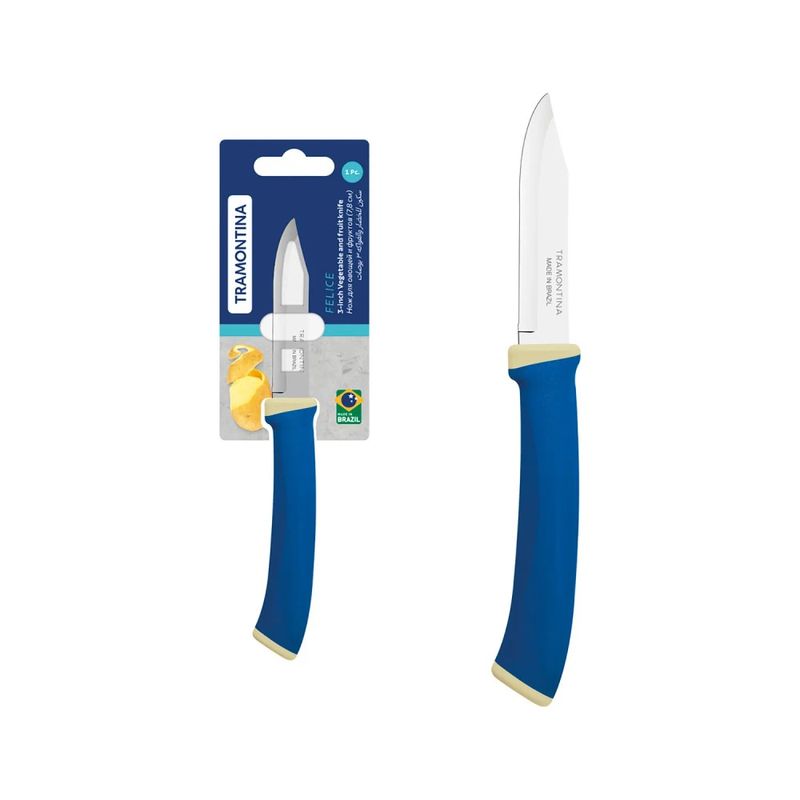A Faca para Legumes e Frutas 3 Felice Azul - Tramontina é uma ferramenta essencial para sua cozinha, projetada para proporcionar cortes precisos e delicados em legumes e frutas. Com lâmina em aço inox de 3 polegadas, assegura um fio afiado por mais tempo e resistência, enquanto o cabo ergonômico de polipropileno azul oferece segurança e conforto no manuseio. Ideal para descascar e preparar alimentos com praticidade, é também fácil de limpar, podendo ser lavada em máquina de lavar louças, o que otimiza seu dia a dia.