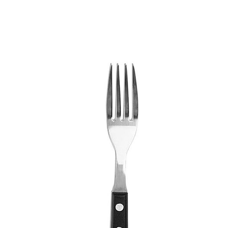 Sim, o cabo do garfo foi projetado para oferecer máxima segurança e conforto. Ele é feito de aço inoxidável e ABS (polímero especial) sobreinjetado na cor preta, e é fixado com rebites de aço inoxidável, assegurando uma pegada firme e estável para todas as suas refeições, especialmente churrascos.