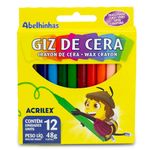 A caixa do Giz de Cera Acrilex contém 12 unidades coloridas, oferecendo uma paleta diversificada para que crianças e estudantes possam explorar um universo de cores em suas criações.