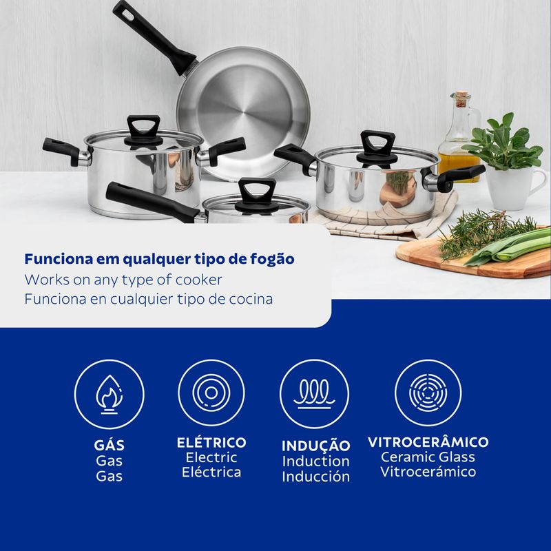 O Jogo De Panelas Brava 4 Peças Inox - Tramontina é perfeita para quem busca praticidade sem abrir mão do estilo. Com design moderno e elegante em inox. Feita pela tradicional fabricante Tramontina, o jogo de panela é confeccionado em aço inox de alta qualidade, com fundo triplo aço inox alumínio aço inox, distribui o calor de maneira uniforme, proporcionando cozimento mais rápido e eficiente. Isso permite que você utilize sempre fogo baixo, garantindo economia de energia e melhor conservação dos alimentos. Os cabos, alças e pegadores em baquelite antitérmico não aquecem, trazendo segurança e conforto no manuseio, além de possuírem protetor de chamas que evita danos durante o uso em fogões a gás. Suas tampas em aço inox possuem saída de vapor e encaixe perfeito, garantindo mais praticidade no preparo das receitas. Compatível com qualquer tipo de fogão gás, elétrico, vitrocerâmico e indução. Acompanha 2 caçarola, 1 panela e 1 frigideira.
