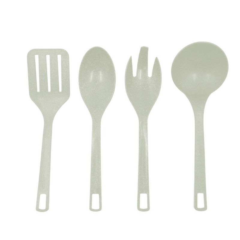 Os utensílios deste conjunto são produzidos em fibra de madeira plástica, um material selecionado pela sua resistência e contribuição para a leveza no manuseio diário.
