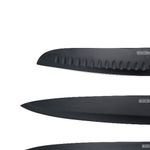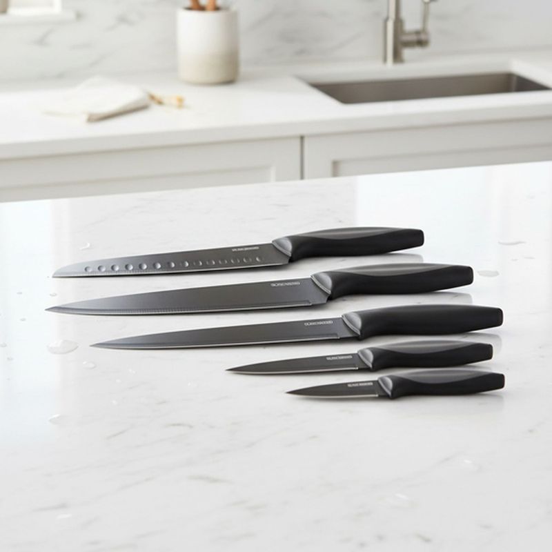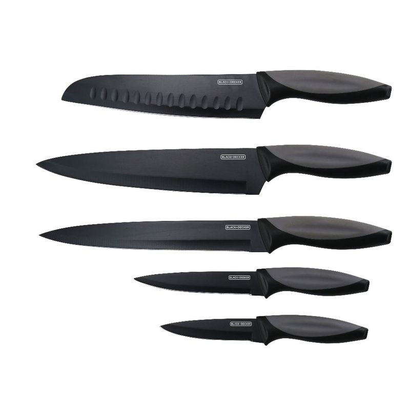 O Jogo de Facas Arko 5 Peças Preto da Black+decker oferece uma faca Santoku (17,8cm) ideal para fatiar, picar e cortar em cubos; uma faca do chef (20,3cm) para uso geral; uma faca de fatiar (20,3cm) adequada para carnes; uma faca utility (11,5cm) para tarefas de porte médio; e uma faca de descascar (8,9cm) para trabalhos delicados.