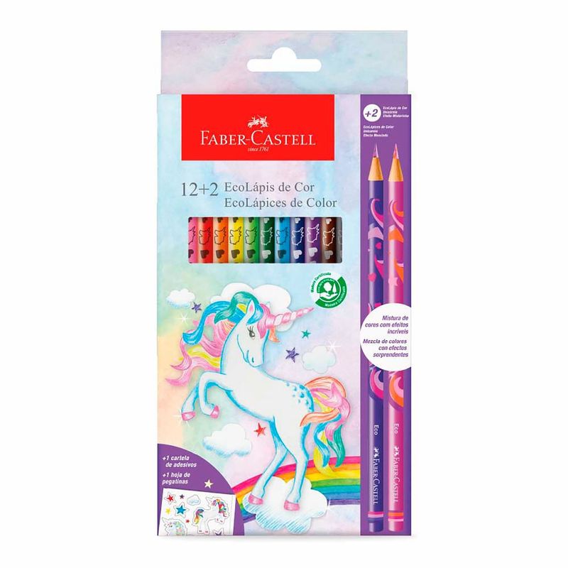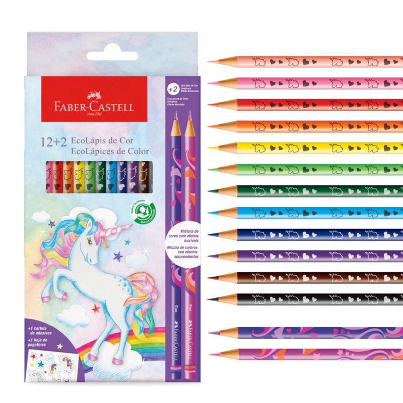O conjunto de Lápis de Cor Ecolápis Unicórnio Faber-Castell inclui 12 cores vibrantes, das quais duas apresentam um efeito misturinha inovador para criações ainda mais especiais.