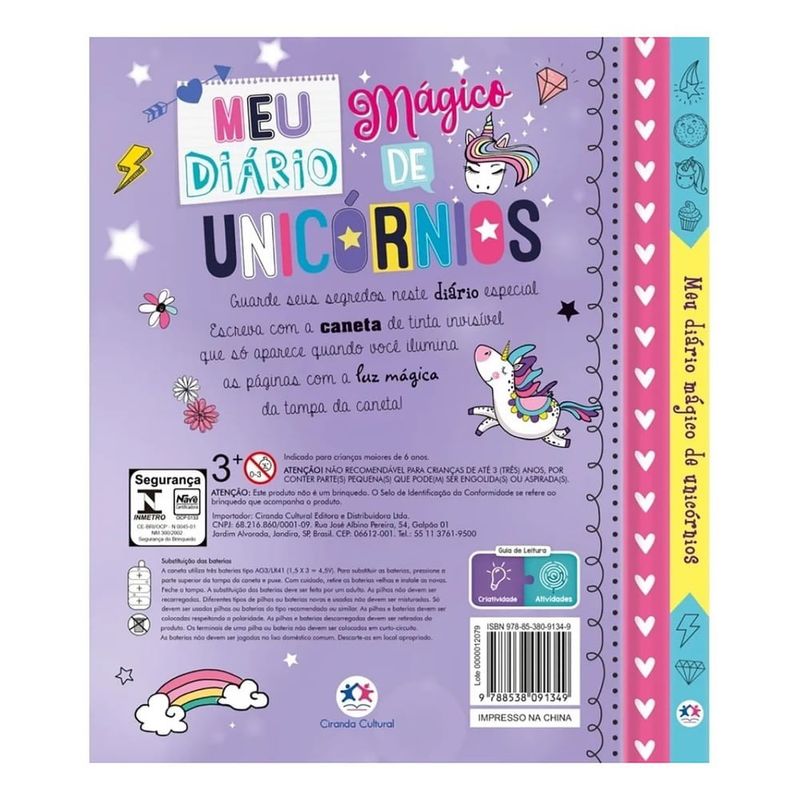 Descubra o encanto do Diário Mágico Unicórnios da Ciranda Cultural, um livro-brinquedo vibrante e colorido, ideal para guardar segredos. Este diário oferece uma experiência de escrita única com sua caneta de tinta invisível, que revela mensagens apenas com a luz mágica embutida na tampa. Com 96 páginas desenhadas para escrita e acabamento em hot stamping, ele convida crianças a partir de 9 anos a explorar um mundo de magia e diversão. Produzido em papel pela Editora Ciranda Cultural, este diário temático de unicórnios é o companheiro ideal para registrar pensamentos, sonhos e aventuras de forma lúdica e segura.