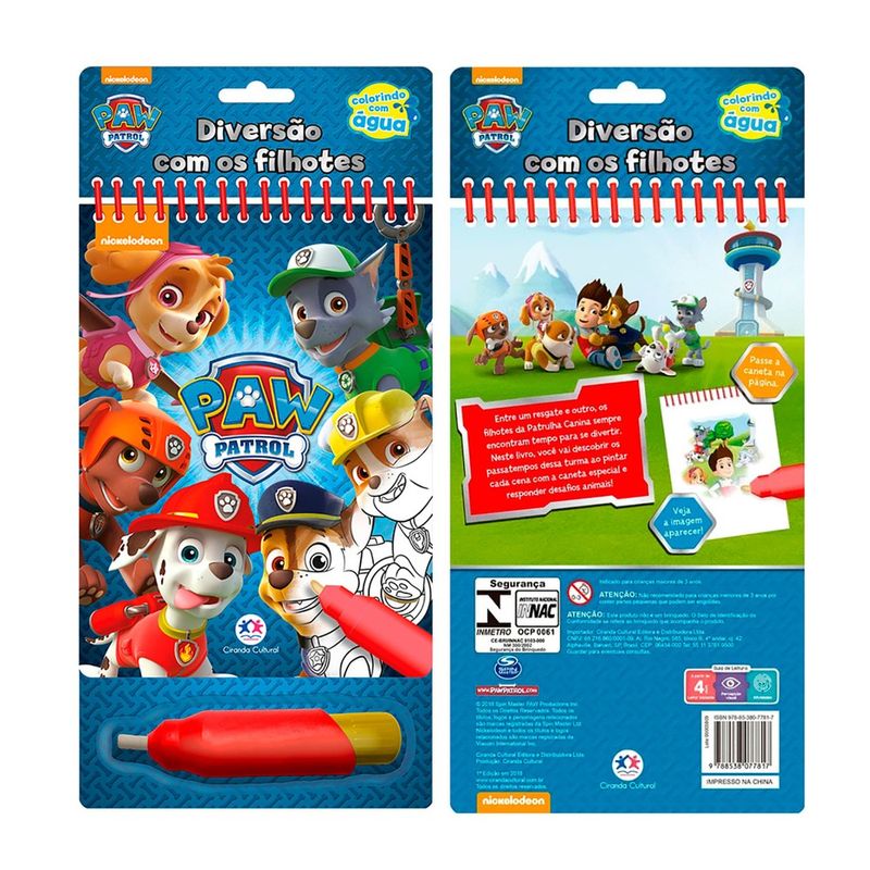 Este livro utiliza um inovador sistema de coloração com água. Basta preencher a caneta especial (inclusa) com água e passá-la sobre as ilustrações. As cores aparecerão magicamente, revelando as cenas dos filhotes da Patrulha Canina. Ao secar, as imagens voltam ao branco, permitindo que a atividade recomece.