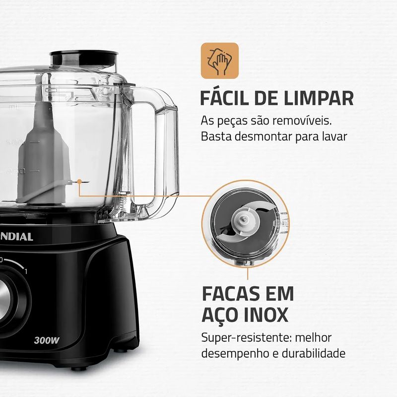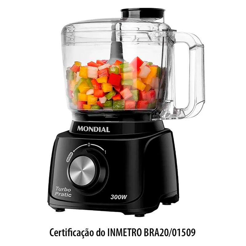 O Mini Processador de Alimentos Turbo Pratic Preto 127V - Mondial permite misturar e triturar alimentos diversos para facilitar o preparo de inúmeras receitas. Compacto e eficiente, possui faca em inox, jarra de 500ml em San Cristal, pés antiderrapantes, com ótima aderência para uso seguro, além de tampa com bocal alimentador, que permite inserir alimentos com agilidade para o processamento. Além disso, as peças são removíveis, o que torna a limpeza muito mais prática.