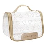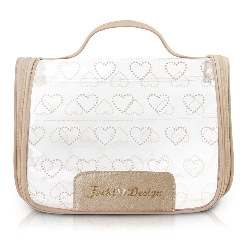 A Nécessaire de Viagem Love Dourado se destaca pelo design elegante, com um toque romântico de coração. Apresenta uma tag da marca Jacki Design adornada com um exclusivo pin de coração dourado, que adiciona um charme especial. Além disso, o material transparente permite visualizar facilmente o conteúdo, enquanto o fecho em zíper garante a segurança dos itens.