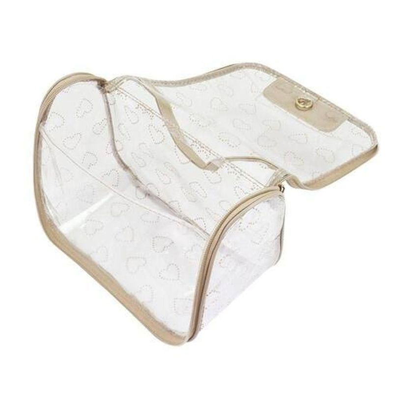 Material em PVC transparente e impermeável que facilita a limpeza e protege os itens contra respingos, ideal para a rotina de viagens.