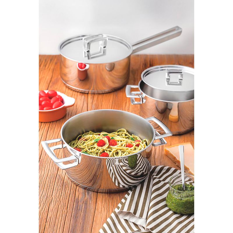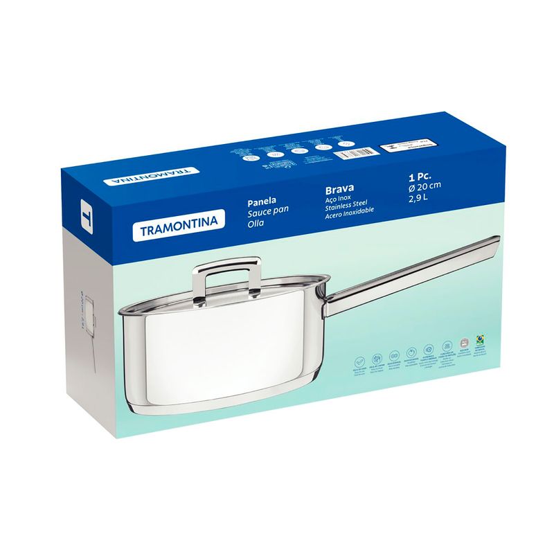 Panela De Inox 20cm Brava - Tramontina. Prepare as suas receitas favoritas de um jeito prático e super saboroso. A Panela Tramontina em Aço Inox Fundo Triplo com Tampa Plana e Cabo 20 cm de diâmetro 2,9 L da linha Brava oferece a possibilidade de realizar diversos preparos e encantar as pessoas que você mais adora com pratos perfeitos. O seu fundo triplo aço inox alumínio aço inox irá deixar o preparo ainda mais fácil, pois distribui o calor de forma uniforme e mantém a comida aquecida por muito mais tempo. O seu acabamento é de alto brilho com design moderno, que deixará a sua cozinha ainda mais elegante, sem ofuscar a verdadeira estrela a sua receita. Mais saudável por ser feita de aço inoxidável, a panela Tramontina não libera nenhum tipo de resíduo nas suas receitas. Fácil de usar uma panela prática para todas as suas receitas e que faz bonito em qualquer tipo de fogão gás, elétrico, vitrocerâmico e indução. Ainda possui tampa com saída de vapor e encaixe perfeito. Mais durável o inox Tramontina é uma matéria-prima nobre, resistente e que vai fazer bonito por muito mais tempo na cozinha. Economiza tempo e energia o segredo está no fundo triplo aço inox alumínio aço inox, que distribui o calor uniformemente, proporcionando um cozimento mais rápido. Por isso, você pode manter o fogo baixo durante todo o preparo e, assim, poupar energia. Além disso, a panela toda em aço inox pode ir ao forno para gratinar ou finalizar pratos, na temperatura máxima de 260C. Fácil de limpar deixar sua panela brilhando é simples, você só precisa de água, sabão e uma esponja macia. Se preferir, é só colocar na máquina de lavar.