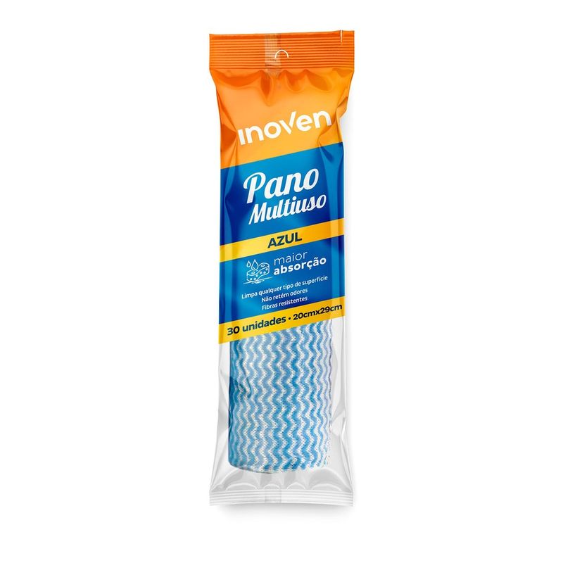Cada rolo do Pano Multiuso Inoven contém 30 unidades de panos individuais. As dimensões de cada pano são de 20x29cm, um tamanho prático e eficiente para diversas tarefas de limpeza.