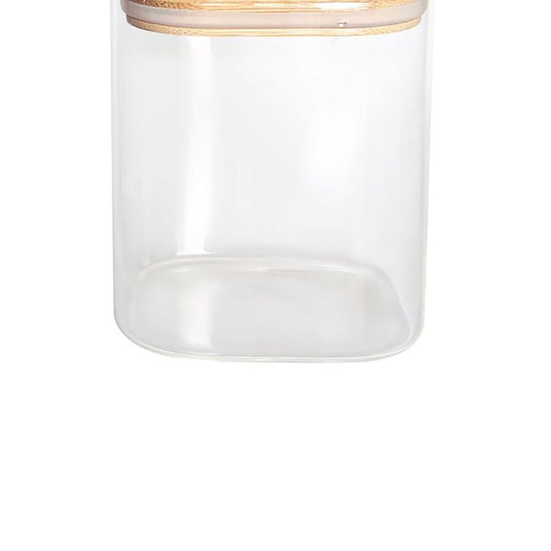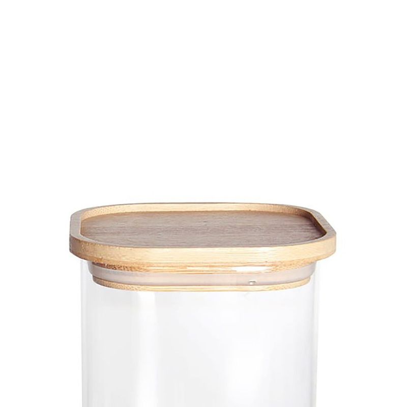 Possui uma tampa de bambu empilhável que oferece uma vedação eficiente, contribuindo para uma organização vertical inteligente e otimizando o espaço em armários e prateleiras.