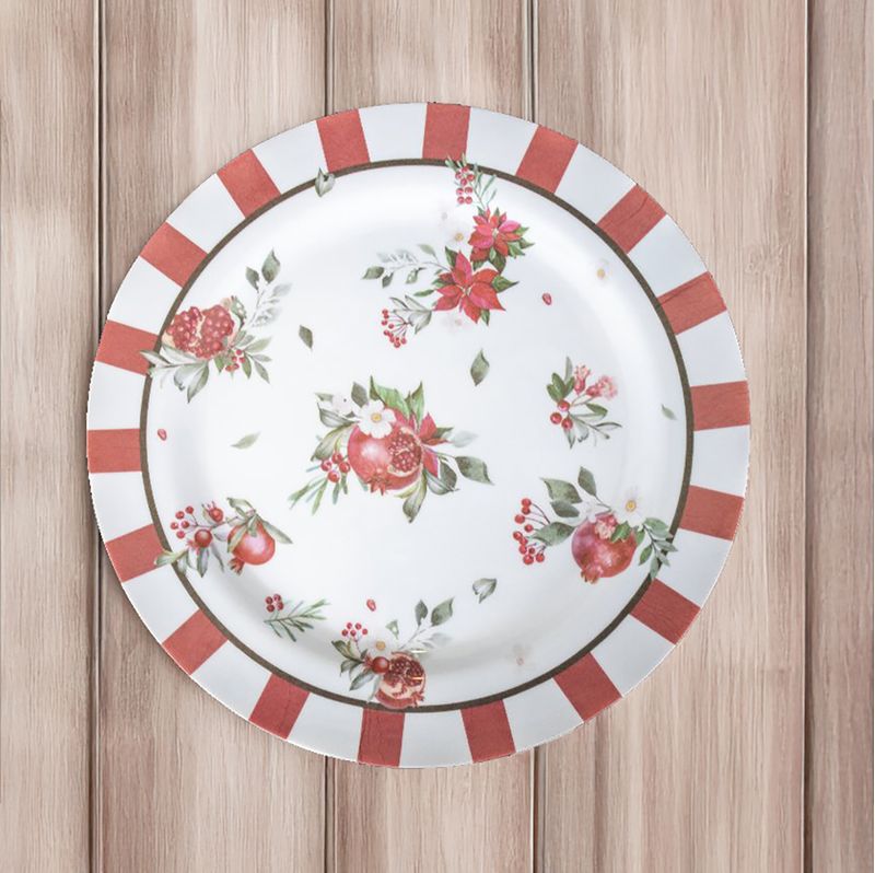 Celebre o Natal com mais beleza e praticidade com o Prato para Bolo Natal 35cm Melanina Yangzi. Com design encantador e temática natalina, ele é perfeito para servir bolos, tortas, panetones e sobremesas com muito estilo nas festas de fim de ano.O prato apresenta estampa floral natalina com flores vermelhas, folhas verdes e detalhes de romãs, além da borda listrada em vermelho e branco, que confere um toque clássico e festivo à mesa. Fabricado em melamina de alta qualidade, o material é resistente, leve e durável, ideal para o uso diário ou em comemorações especiais.Com 35cm de diâmetro, possui tamanho generoso para servir com praticidade e elegância, tornando-se uma peça indispensável para quem deseja unir funcionalidade e decoração na ceia de Natal.