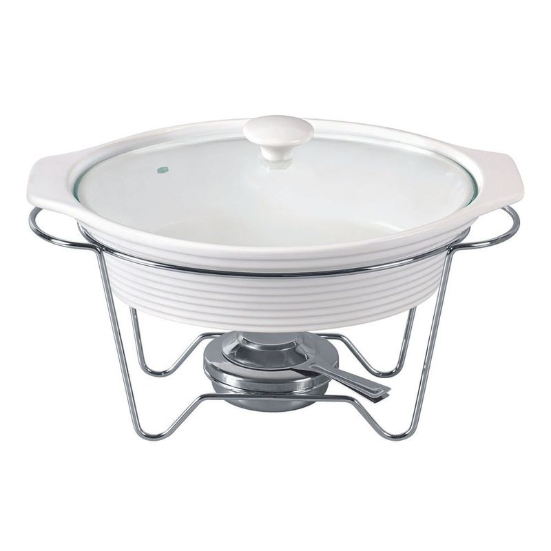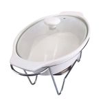 O Rechaud Oval Eleonora é composto por uma estrutura de porcelana na cor branca, uma tampa de vidro e um queimador e suporte em aço inox, que asseguram a resistência e eficiência do aquecimento. Suas dimensões são 17.5 cm de altura, 23.9 cm de largura e 36.8 cm de comprimento, tornando-o um item elegante e funcional para sua mesa.