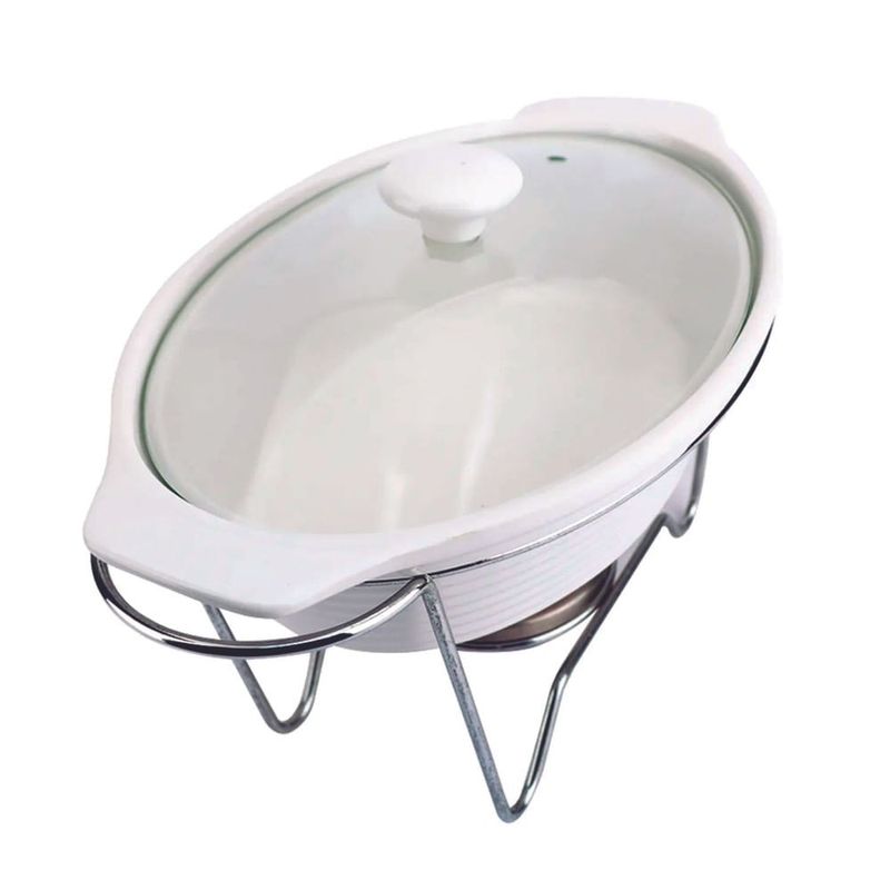 O Rechaud Oval Eleonora 2.3L Branco - Full Fit é a solução ideal para servir suas refeições com elegância e praticidade, garantindo que permaneçam aquecidas por mais tempo. Com uma generosa capacidade de 2.3 litros, este rechaud combina a sofisticação da estrutura em porcelana branca e a funcionalidade da tampa de vidro, que permite a visualização dos alimentos. A resistência é garantida pelo queimador e suporte em aço inox, que proporcionam aquecimento eficiente e estável. Perfeito para diversas ocasiões, desde jantares especiais a eventos familiares, ele eleva a apresentação dos seus pratos, mantendo-os na temperatura ideal para o máximo aproveitamento.
