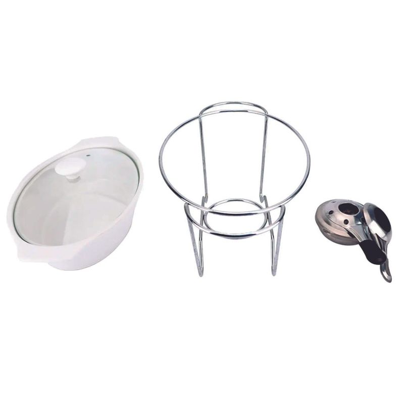 Ao adquirir o Rechaud Oval Eleonora, a embalagem inclui um Rechaud, uma Tampa de vidro, um Pedestal Aramado para suporte e um Queimador para o sistema de aquecimento. Este conjunto completo oferece tudo o que você precisa para começar a servir com elegância e praticidade.