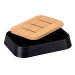 A saboneteira é fabricada com estrutura em poliestireno e possui detalhes em bambu, conferindo durabilidade e um acabamento natural ao produto.