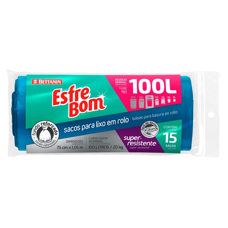 O Saco de Lixo Rolo 100L - Esfrebom contém 15 sacos destacáveis. Cada saco possui capacidade para 100 litros, ideal para lixeiras de chão. É mais higiênico, super resistente por possui fundo reforçado e é prático.
