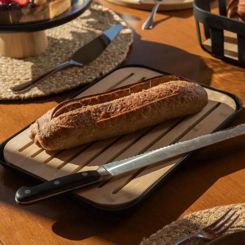 A Tábua De Pão Migalheira Lume Bambu Preta - Ou é ideal para quem busca praticidade, organização e estilo à mesa, no dia a dia ou ocasiões especiais. Perfeita para cortar pão, ela conta com ranhuras que direcionam as migalhas para a bandeja coletora, garantindo mais higiene e evitando sujeiras na mesa ou bancada. Com design minimalista une o charme natural do bambu com a base em plástico fosco, criando uma peça moderna, resistente e sofisticada. Além de funcional, a tábua transforma o momento de servir pães e alimentos em uma experiência mais acolhedora e elegante. Feita pela fabricante Ou, a tábua migalheira da linha Lume é confeccionada em PP e bambu de alta qualidade. Na cor preta, possui dimensão de 2x23x33cm.